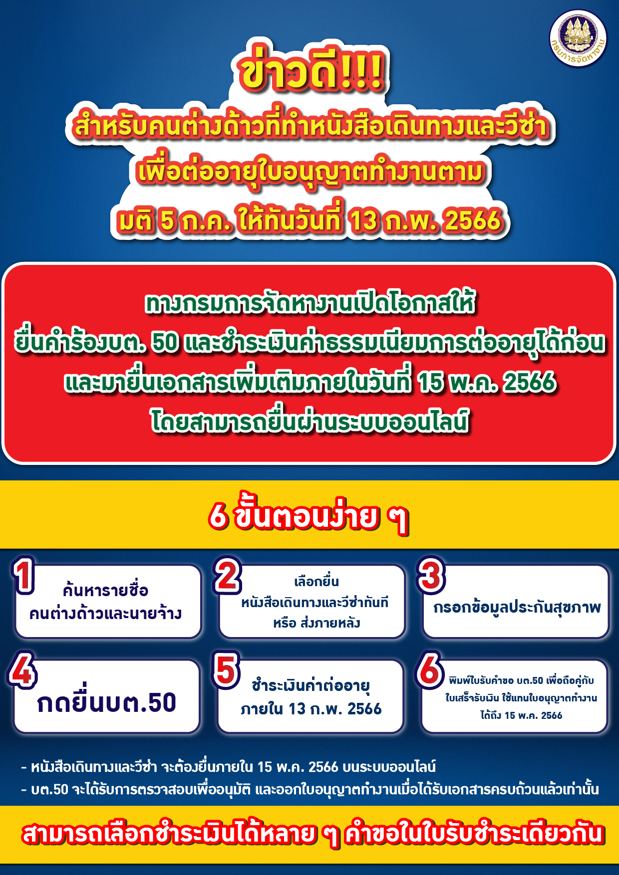 สำหรับคนต่างด้าวที่ทำหนังสือเดินทางและวีช่า เพื่อต่ออายุใบอนุญาตทำงานตามมติ 5 ก.ค. ให้ทันวันที่ 13 ก.พ. 2566 ทางกรมการจัดหางานเปิดโอกาสให้ยื่นคำร้องบต. 50 และชำระเงินค่าธรรมเนียมการต่ออายุได้ก่อน และมายื่นเอกสารเพิ่มเติมภายในวันที่ 15 พ.ค . 2556 โดยสามารถยื่นผ่านระบบออนไลน์