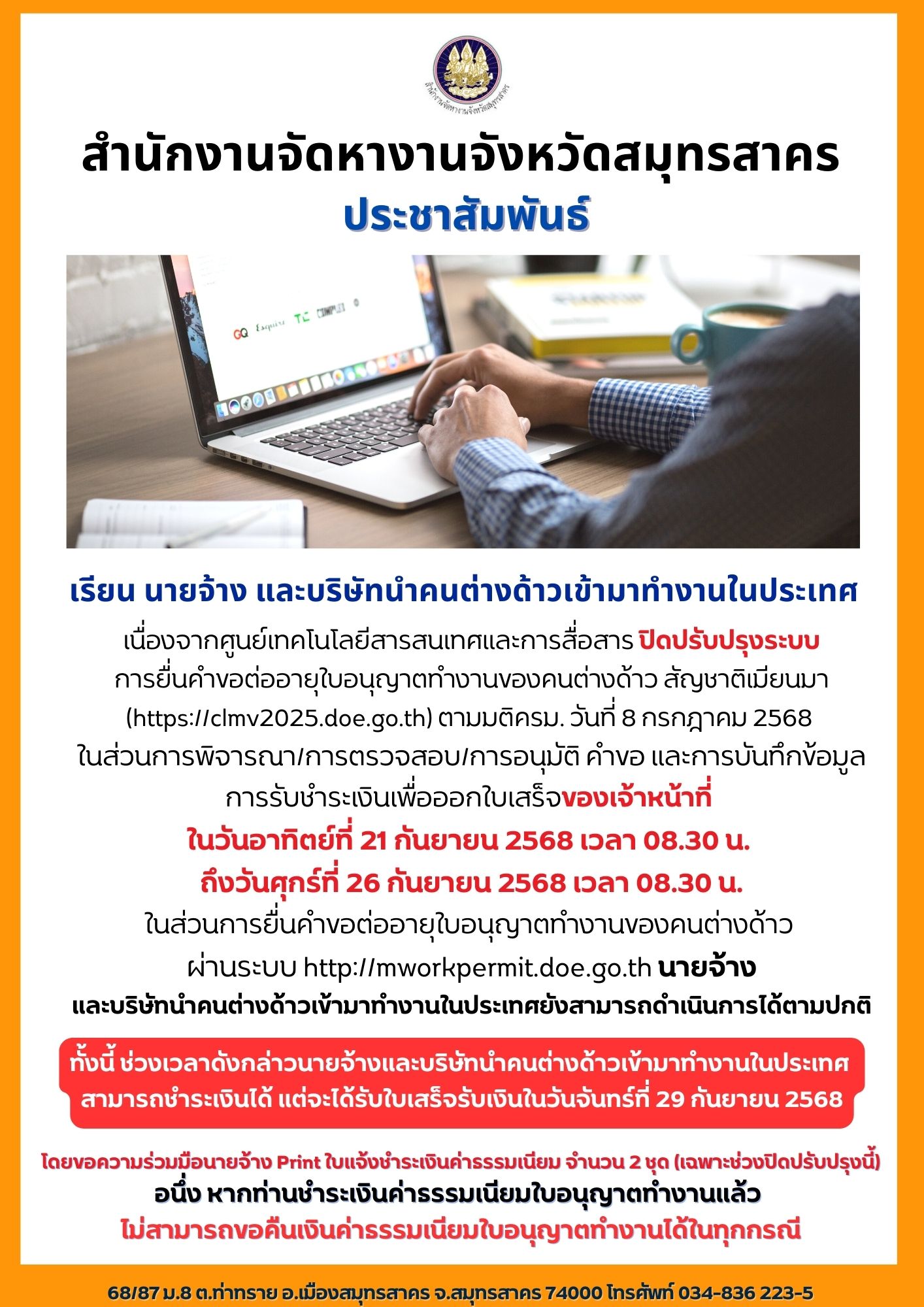 เนื่องจากศูนย์เทคโนโลยีสารสนเทศและการสื่อสาร ปิดปรับปรุงระบบการยื่นคำขอต่ออายุใบอนุญาตทำงานของคนต่างด้าว สัญชาติเมียนมา (https://clmv2025.doe.go.th) ตามมติครม.วันที่ 8 กรกฎาคม 2568 ในส่วนการพิจารณา/การตรวจสอบ/การอนุมัติ คำขอ และการบันทึกข้อมูลการรับชำระเงินเพื่อออกใบเสร็จของเจ้าหน้าที่