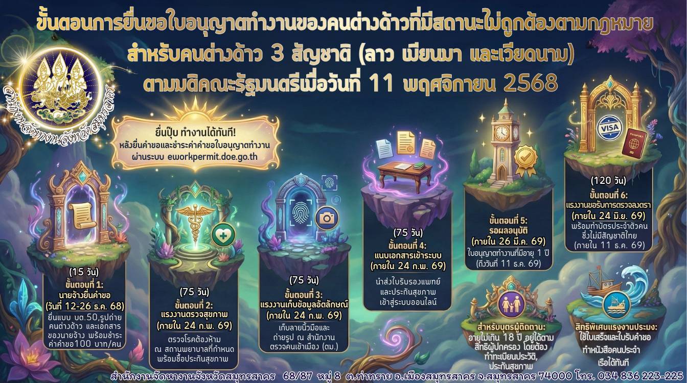 ขั้นตอนการยื่นขอใบอนุญาตทำงานของคนต่างด้าวที่มีสถานะไม่ถูกต้องตามกฎหมาย สำหรับคนต่างด้าว 3 สัญชาติ (ลาว เมียนมา และเวียดนาม)