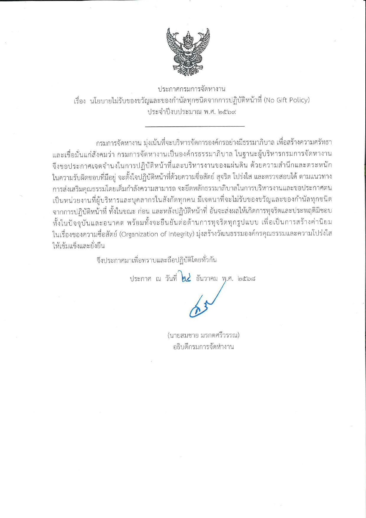 ประชาสัมพันธ์ เรื่อง ประกาศเจตนารมณ์ no gift policy กรมการจัดหางาน