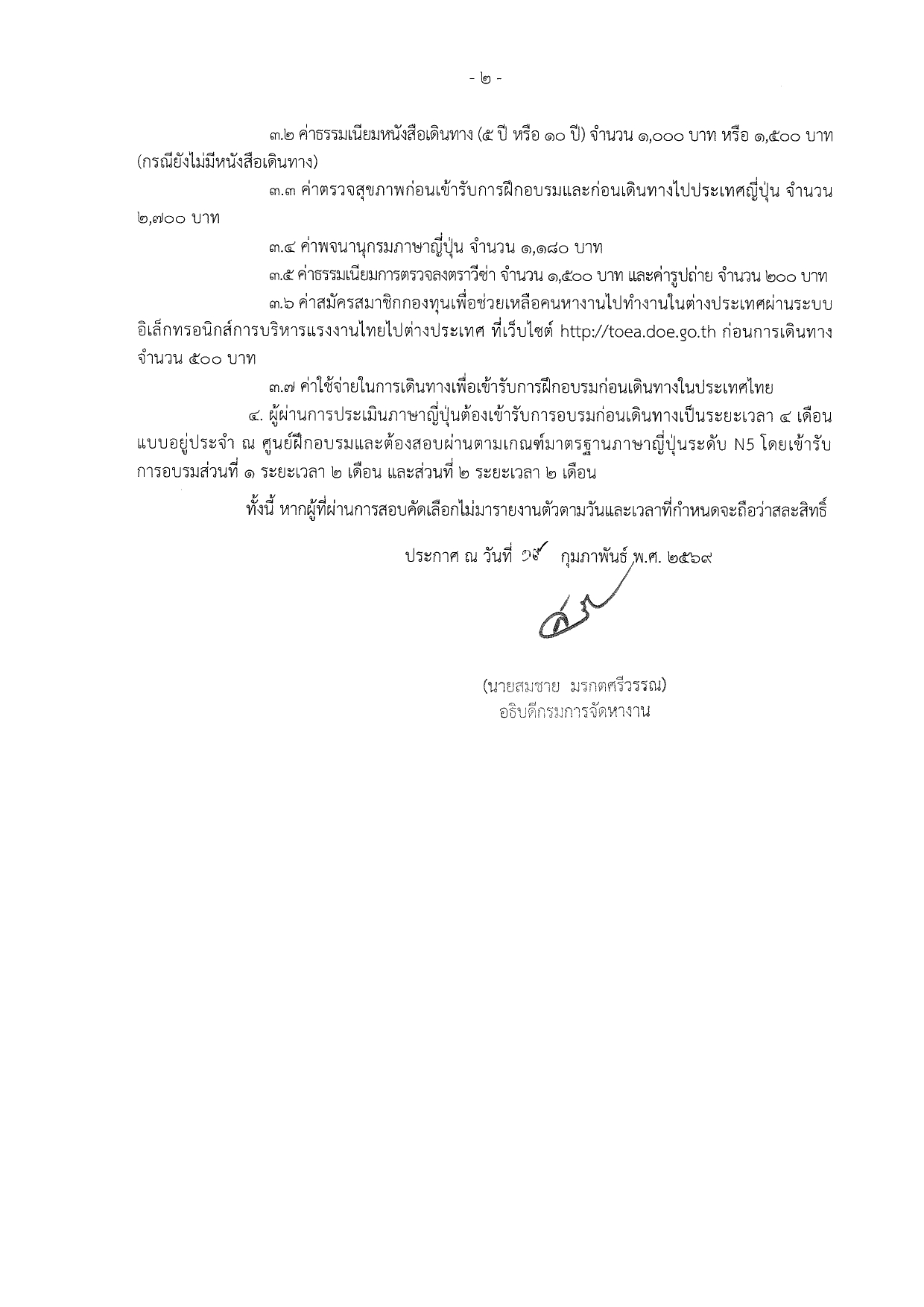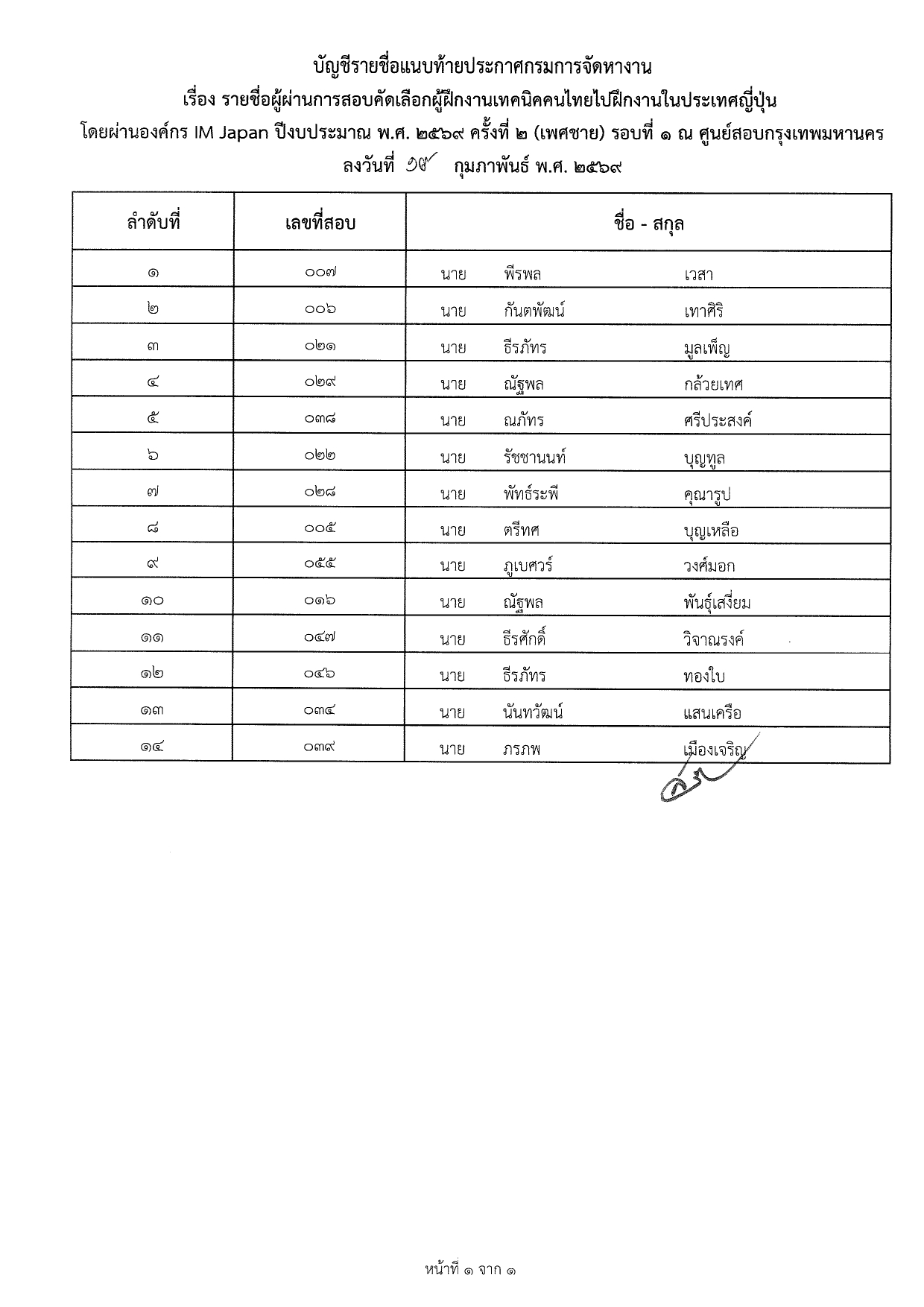 ประกาศกรมการจัดหางาน เรื่อง รายชื่อผู้ผ่านการสอบคัดเลือกผู้ฝึกงานเทคนิคคนไทยไปฝึกงานในประเทศญี่ปุ่น โดยผ่านองค์กร IM Japan ปีงบประมาณ พ.ศ. 2569 ครั้งที่ 2 (เพศชาย) รอบที่ 1 ณ ศูนย์สอบกรุงเทพมหานคร