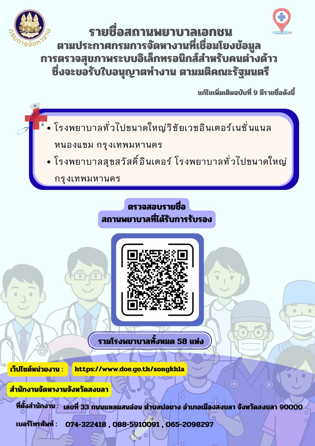 รายชื่อสถานพยาบาลเอกชน ตามประกาศกรมการจัดหางานกำหนด ที่เชื่อมโยงข้อมูลการตรวจสุขภาพระบบอิเล็กทรอนิกส์ แก้ไขเพิ่มเติมฉบับที่ 9