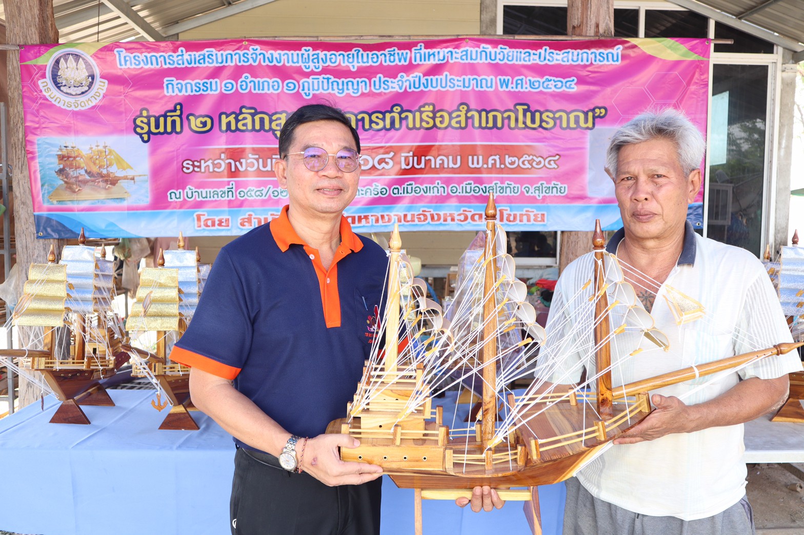 สำนักงานจัดหางานจังหวัดสุโขทัยจัดฝึกอบรมอาชีพหลักสูตร "การทำเรือสำเภาโบราณ" พร้อมมอบประกาศนียบัตรแก่ผู้ผ่านการอบรม ตามโครงการส่งเสริมการจ้างงานผู้สูงอายุในอาชีพที่เหมาะสมกับวัยและประสบการณ์ กิจกรรม 1 อำเภอ 1 ภูมิปัญญา ประจำปีงบประมาณ พ.ศ. 2564 มีผู้เข้ารับการอบรมจำนวน 10 คน ระหว่างวันที่ 16 - 18 มีนาคม 2564 ณ 158/12 หมู่ที่ 4 ตำบลเมืองเก่า อำเภอเมืองสุโขทัย จังหวัดสุโขทัย อำนวยการโดยนายปัญญา ขาวเขียว จัดหางานจังหวัดสุโขทัย