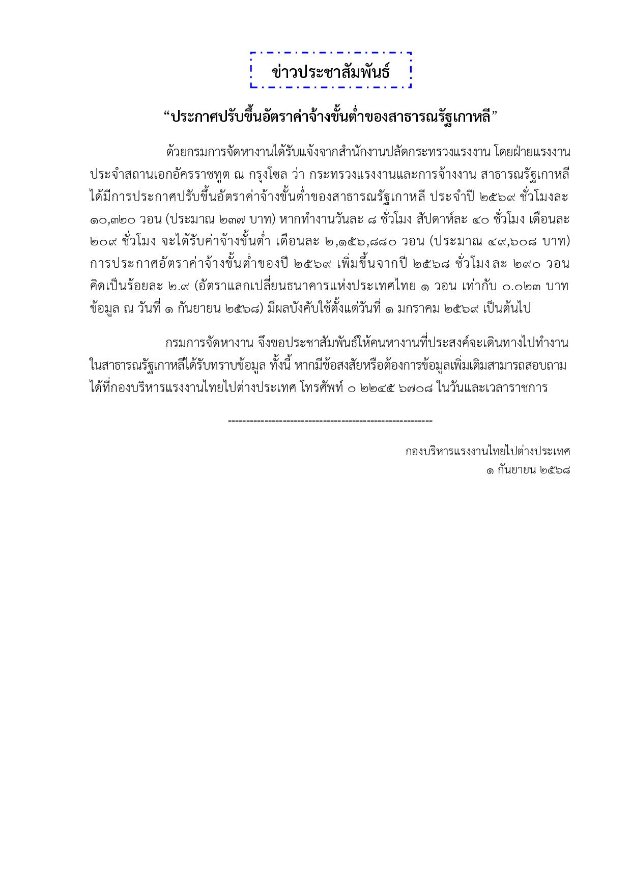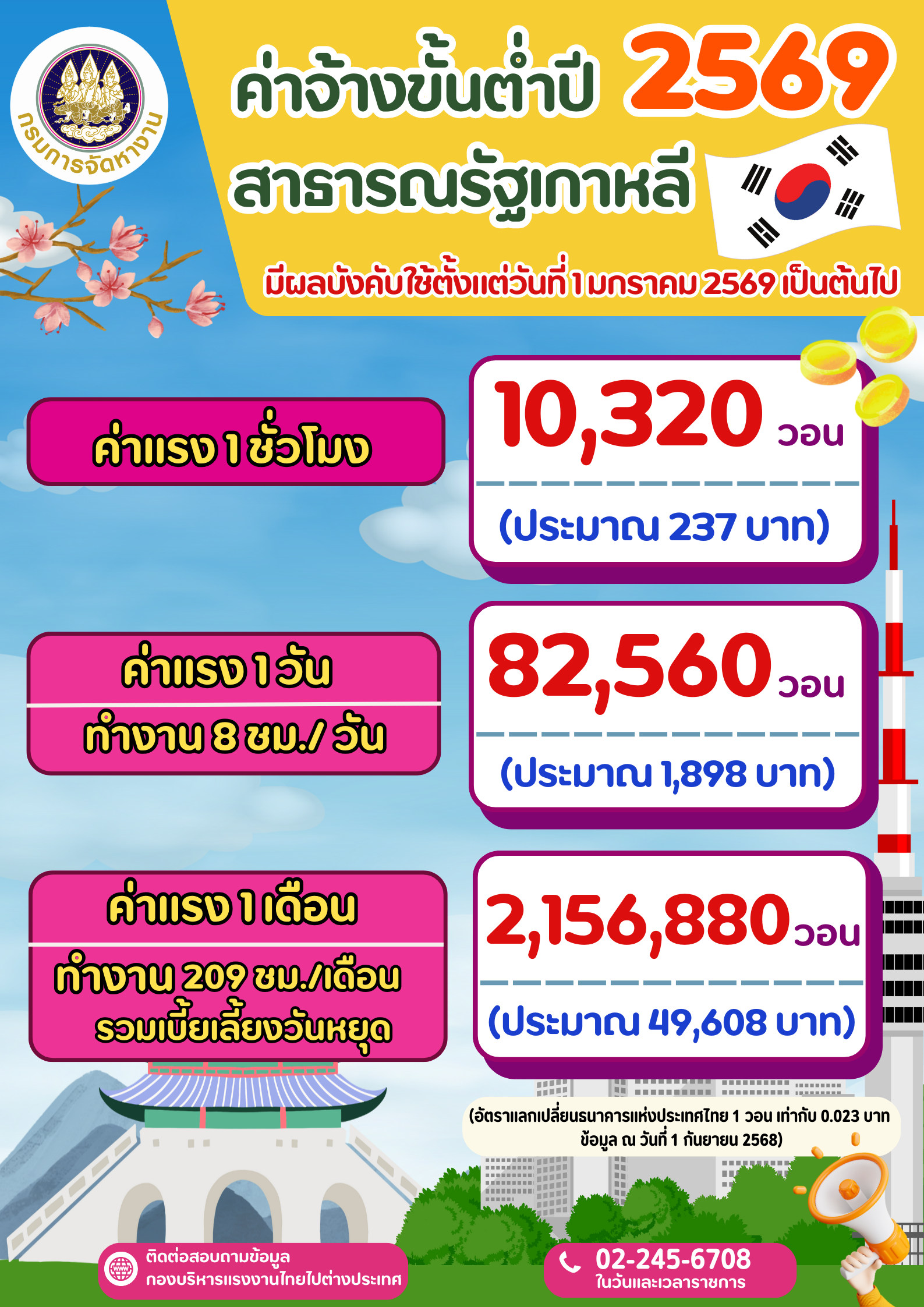 ประชาสัมพันธ์ ประกาศปรับขึ้นอัตราค่าจ้างขั้นต่ำของสาธารณรัฐเกาหลี ปี 2569