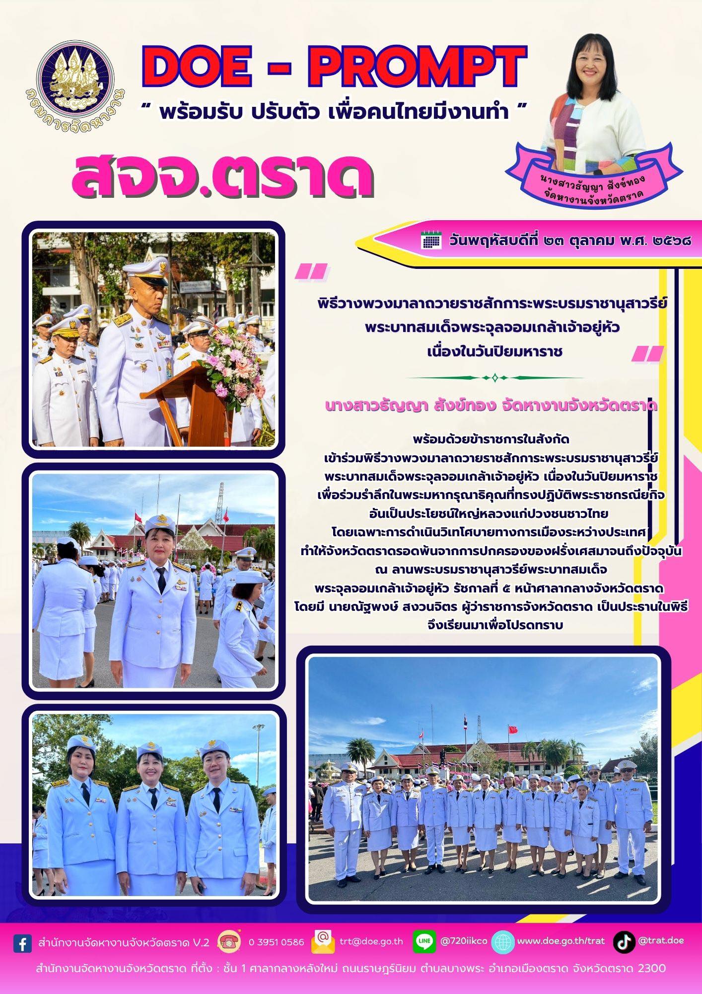 วันพฤหัสบดีที่ ๒๓ ตุลาคม พ.ศ. ๒๕๖๘ นางสาวธัญญา สังข์ทอง จัดหางานจังหวัดตราด พร้อมด้วยข้าราชการในสังกัด เข้าร่วมพิธีวางพวงมาลาถวายราชสักการะพระบรมราชานุสาวรีย์ พระบาทสมเด็จพระจุลจอมเกล้าเจ้าอยู่หัว เนื่องในวันปิยมหาราช เพื่อร่วมรำลึกในพระมหากรุณาธิคุณที่ทรงปฏิบัติพระราชกรณียกิจอันเป็นประโยชน์ใหญ่หลวงแก่ปวงชนชาวไทย โดยเฉพาะการดำเนินวิเทโศบายทางการเมืองระหว่างประเทศ ทำให้จังหวัดตราดรอดพ้นจากการปกครองของฝรั่งเศสมาจนถึงปัจจุบัน ณ ลานพระบรมราชานุสาวรีย์พระบาทสมเด็จพระจุลจอมเกล้าเจ้าอยู่หัว รัชกาลที่ ๕ หน้าศาลากลางจังหวัดตราด โดยมี นายณัฐพงษ์ สงวนจิตร