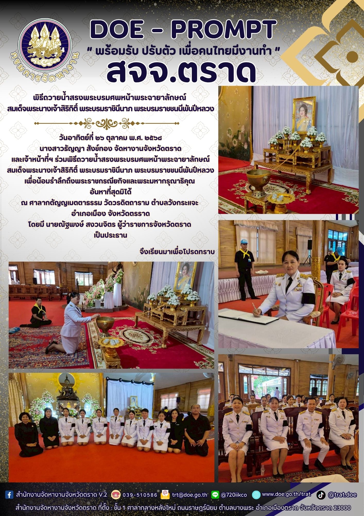 วันอาทิตย์ที่ ๒๖ ตุลาคม พ.ศ. ๒๕๖๘ นางสาวธัญญา สังข์ทอง จัดหางานจังหวัดตราด และเจ้าหน้าที่ฯ ร่วมพิธีถวายน้ำสรงพระบรมศพหน้าพระฉายาลักษณ์ สมเด็จพระนางเจ้าสิริกิติ์ พระบรมราชินีนาภ พระบรมราชชนนีพันปีหลวง เพื่อน้อมรำลึกถึงพระราชกรณียกิจและพระมหากรุณาธิคุณ อันหาที่สุดมิได้ ณ ศาลากตัญญเมตตาธรรม