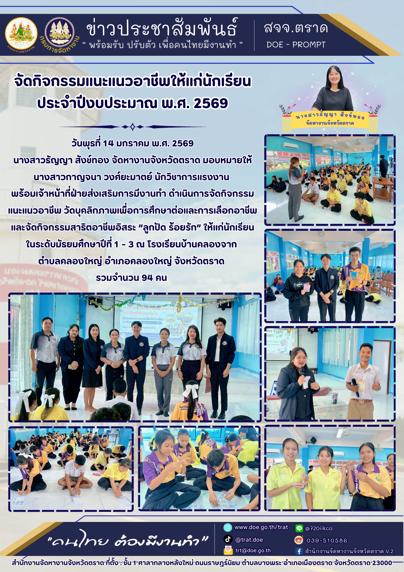 นางสาวธัญญา สังข์ทอง จัดหางานจังหวัดตราด มอบหมายให้