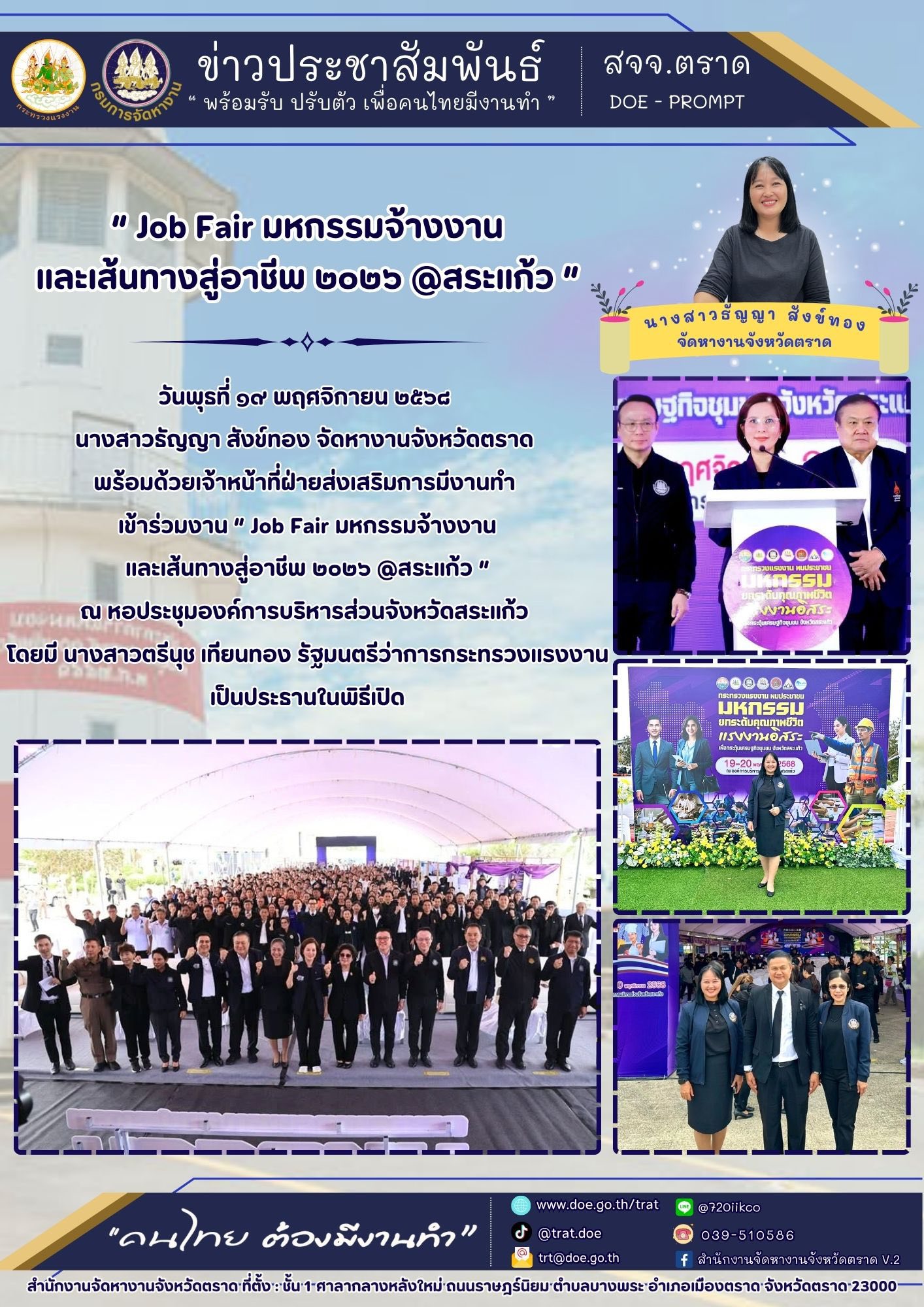 วันพุธที่ ๑๙ พฤศจิกายน ๒๕๖๘ นางสาวธัญญา สังข์ทอง จัดหางานจังหวัดตราด พร้อมด้วยเจ้าหน้าที่ฝ่ายส่งเสริมการมีงานทำ เข้าร่วมงาน “ Job Fair มหกรรมจ้างงานและเส้นทางสู่อาชีพ ๒๐๒๖ @สระแก้ว “ ณ หอประชุมองค์การบริหารส่วนจังหวัดสระแก้ว โดยมี นางสาวตรีนุช เทียนทอง รัฐมนตรีว่าการกระทรวงแรงงาน เป็นประธานในพิธีเปิด