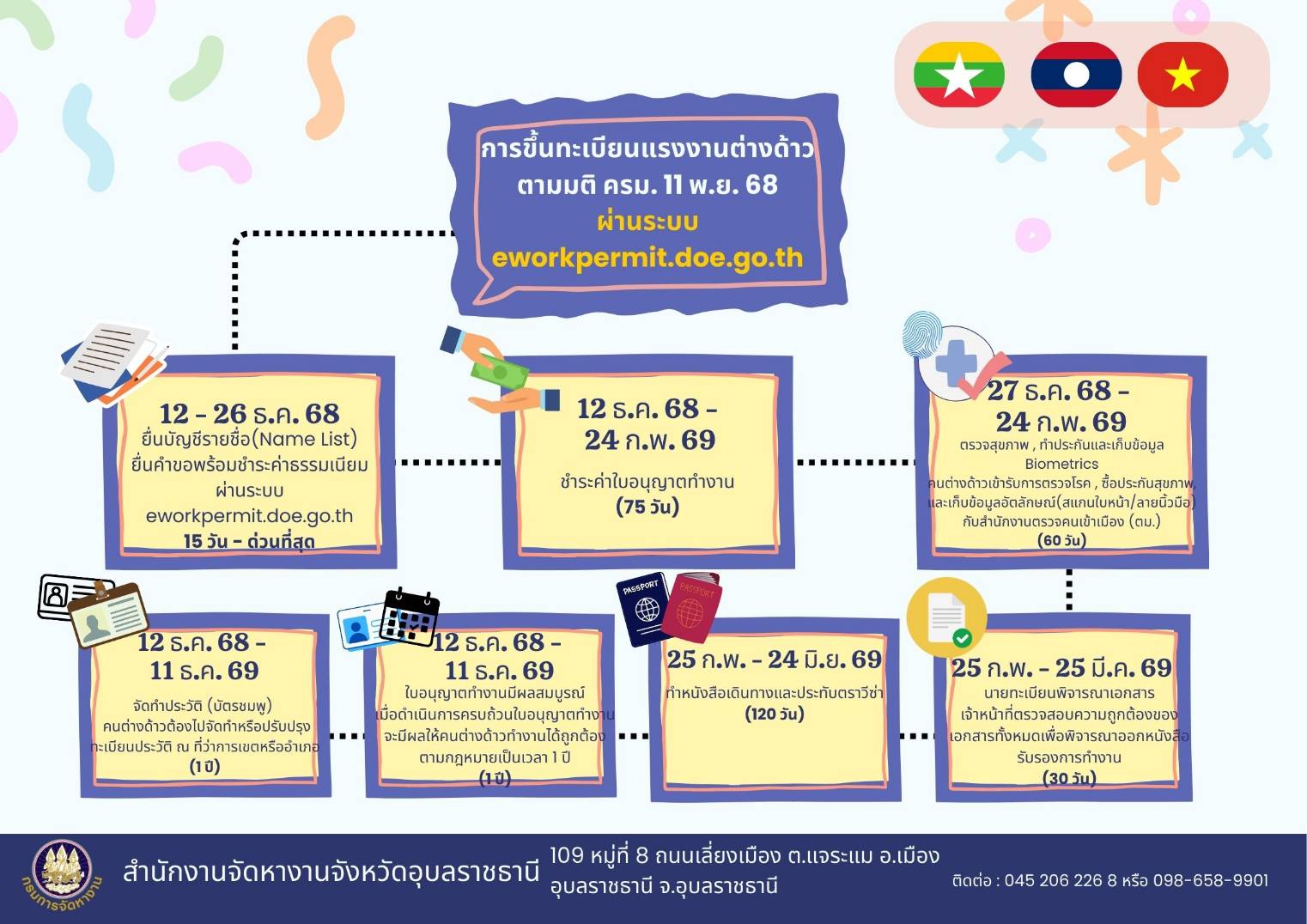 ขั้นตอนการยื่นขอใบอนุญาตทำงานของคนต่างด้าวที่มีสถานะไม่ถูกต้องตามกฎหมาย 3 สัญชาติ (ลาว เมียนมา และเวียดนาม) มติ ครม.11 พ.ย.2568