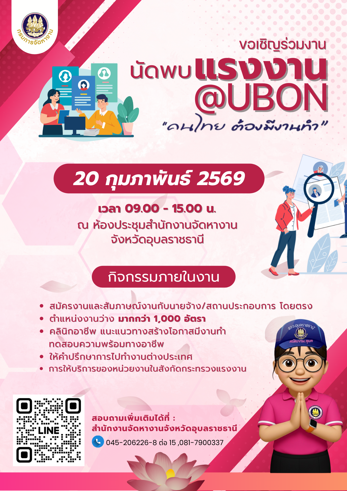 สำนักงานจัดหางานจังหวัดอุบลราชธานี จึงขอเชิญชวนนักเรียน นักศึกษา ผู้จบการศึกษาใหม่ ประชาชนที่ประสงค์จะหางานทำ ผู้ต้องการเปลี่ยนงาน ผู้สูงอายุ คนพิการ และประชาชนทั่วไป เข้าร่วมชมงาน ฟรี ในวันศุกร์ที่ 20 กุมภาพันธ์ 2569 เวลา 08.30 – 15.00 น. ณ สำนักงานจัดหางานจังหวัดอุบลราชธานี สอบถามรายละเอียดเพิ่มเติม ได้ที่ สำนักงานจัดหางานจังหวัดอุบลราชธานี เลขที่ 109 หมู่ที่ 8 ตำบลแจระแม อำเภอเมืองอุบลราชธานี จังหวัดอุบลราชธานี โทร. 045-206226-8 E-Mail : ubon.doe@gmail.com