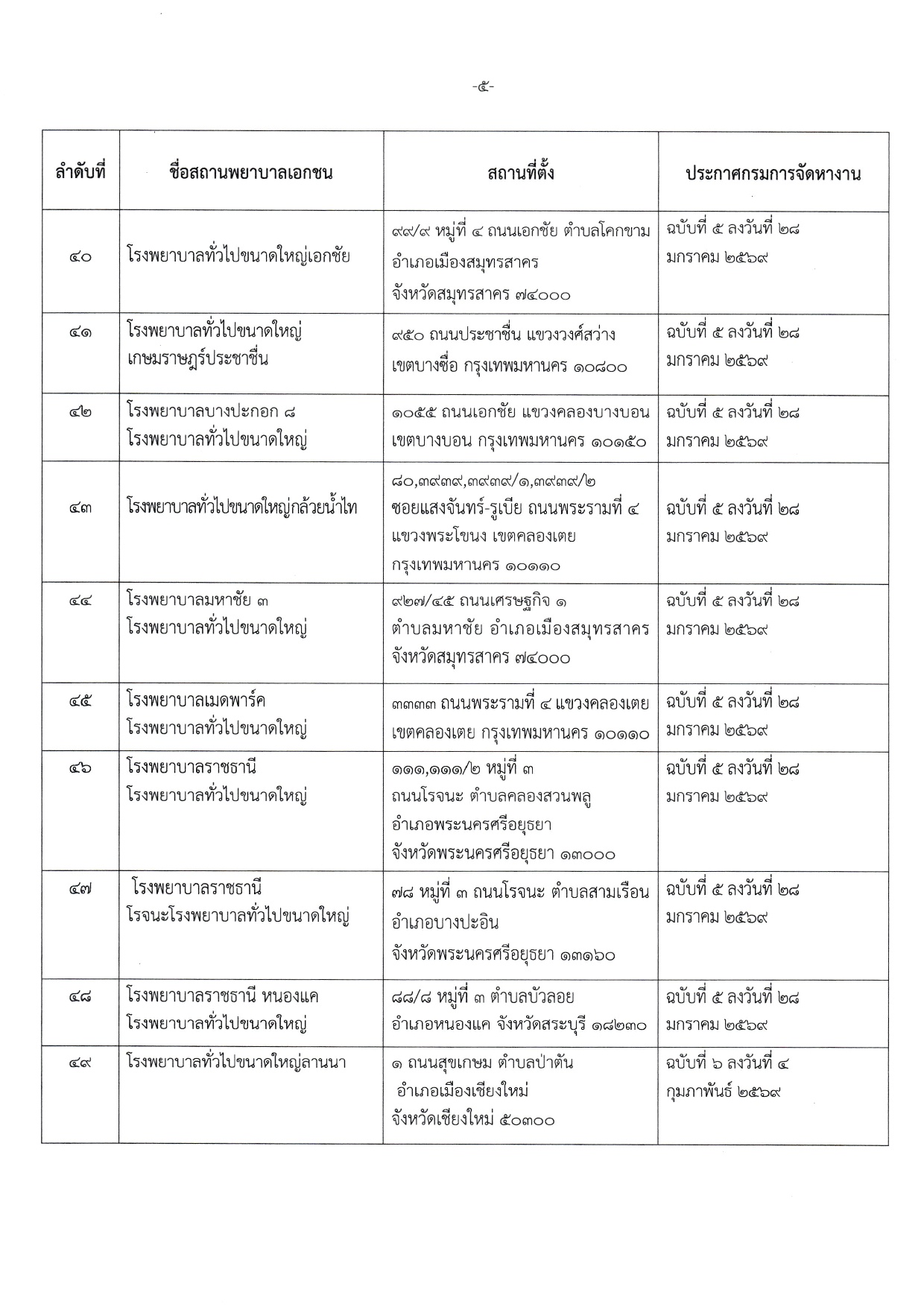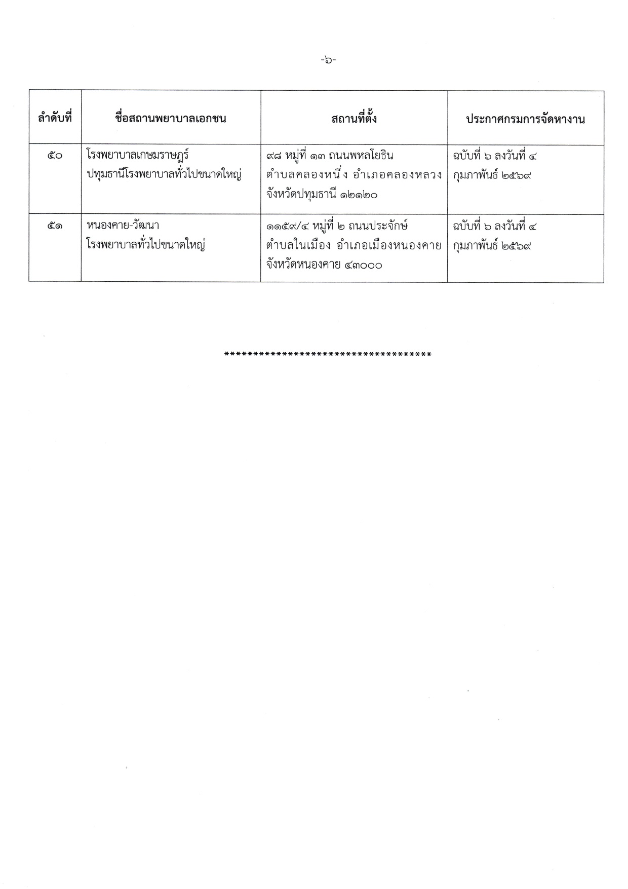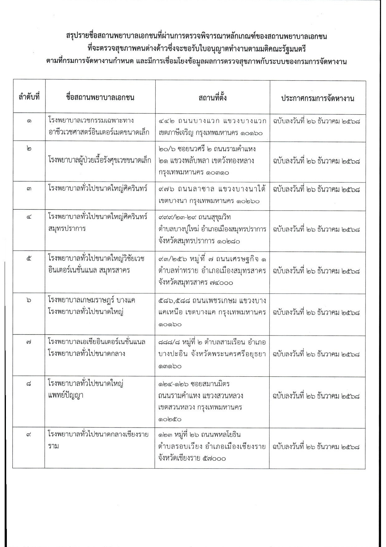 รายชื่อสถานพยาบาลเอกชนที่จะตรวจสุขภาพคนต่างด้าวตามติคณะรัฐมนตรี (ประกาศ กรมการจัดหางาน ฉบับที่ 1-6)
