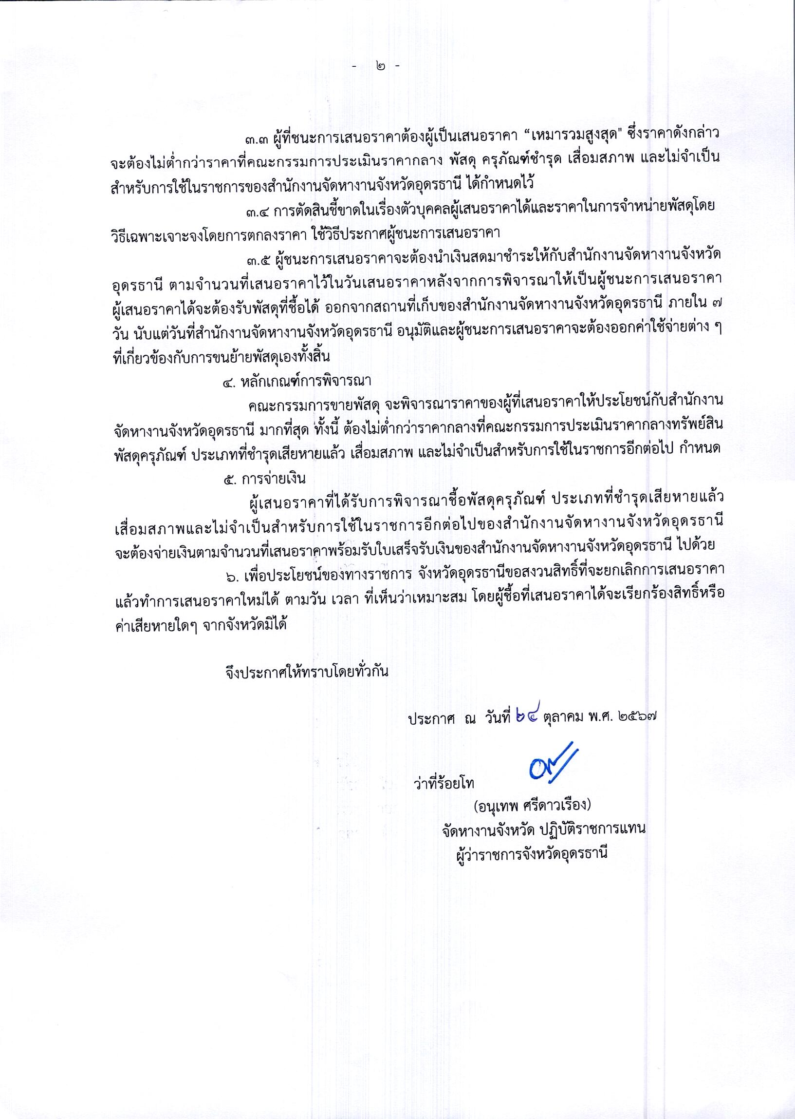 ประกาศจังหวัดอุดรธานี เรื่อง การขายพัสดุชำรุดและเสื่อมสภาพ โดยวีธีเฉพาะเจาะจง