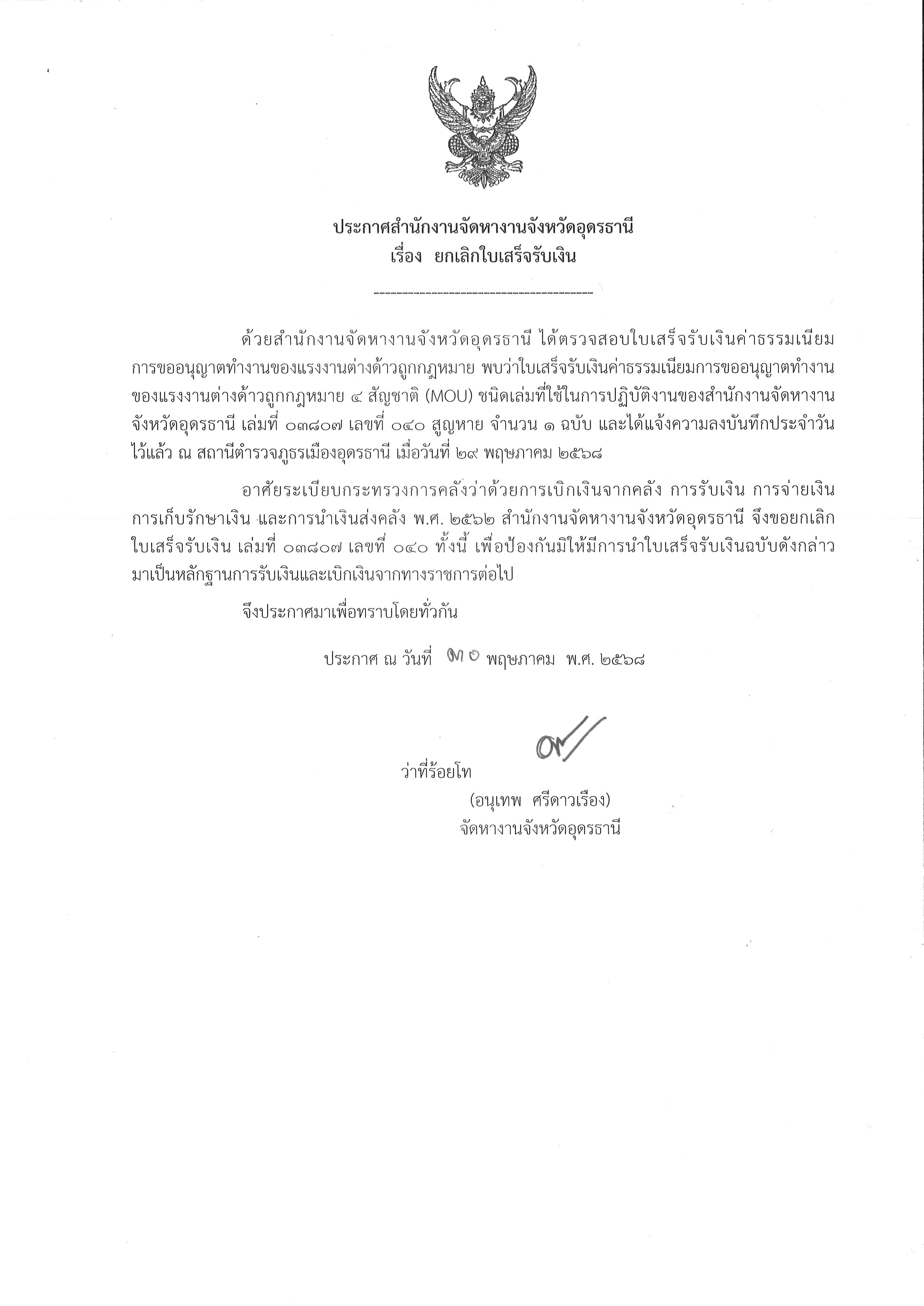 ประกาศสำนักงานจัดหางานจังหวัดอุดรธานี เรื่อง ยกเลิกใบเสร็จรับเงิน