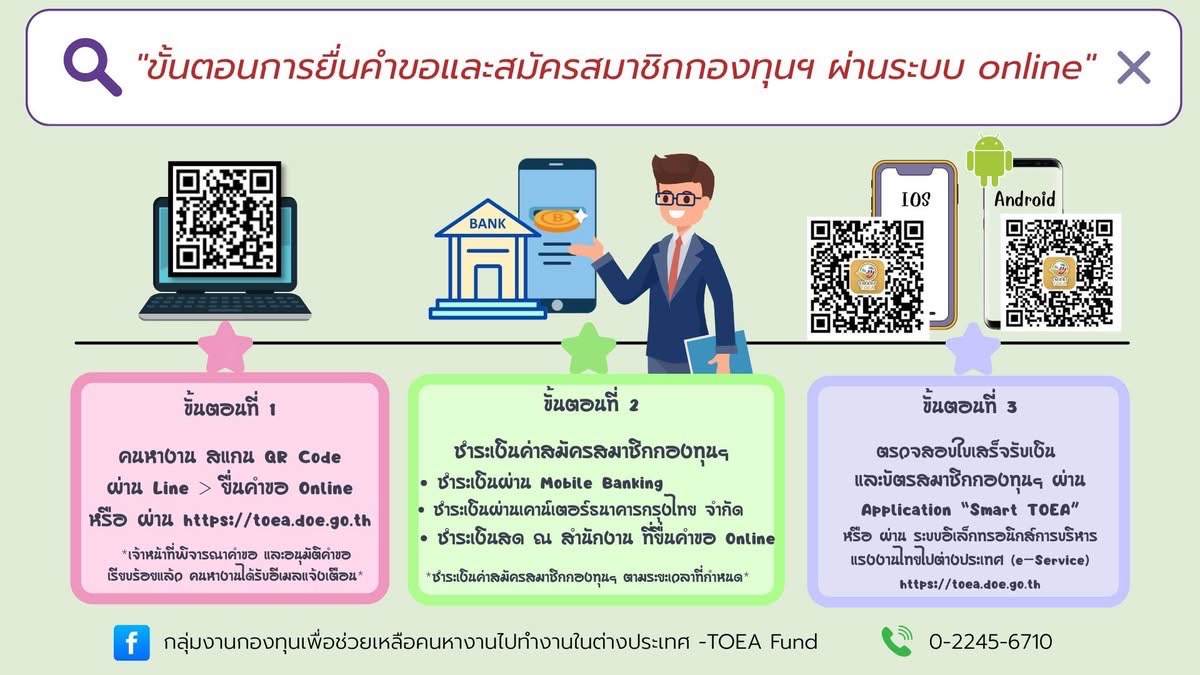 ติดต่อสอบถามเพิ่มเติมได้ที่ กลุ่มงานกองทุนเพื่อช่วยเหลือคนหางานไปทำงานในต่างประเทศ หรือสำนักงานจัดหางานจังหวัดทุกจังหวัด