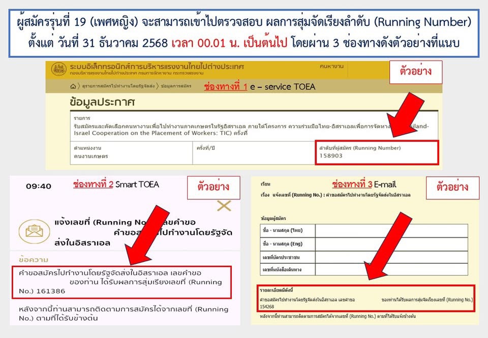 ผู้สมัครสามารถเข้าไปตรวจสอบ หมายเลขประจำตัว (Running Number) ในวันที่ 31 ธันวาคม 2568 ตั้งแต่เวลา 00.01 น. โดยผ่าน 3 ช่องทาง ได้แก่