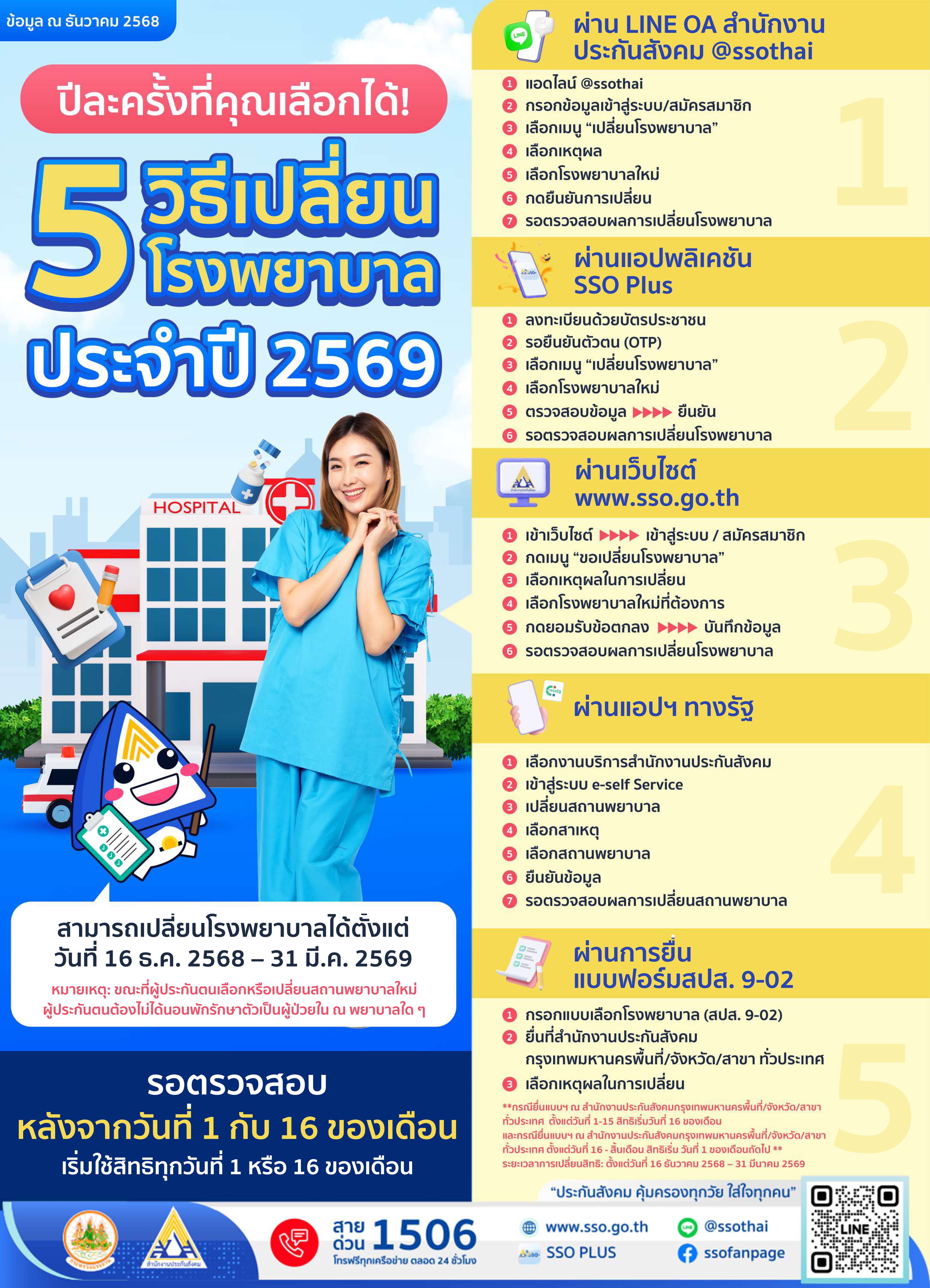 เริ่มแล้ว !!! เปลี่ยนโรงพยาบาลประจำปี 2569 สิทธิดีๆ ของผู้ประกันตน เปลี่ยนได้ปีละครั้งเท่านั้น ตั้งแต่วันที่ 16 ธันวาคม 2568 - 31 มีนาคม 2569