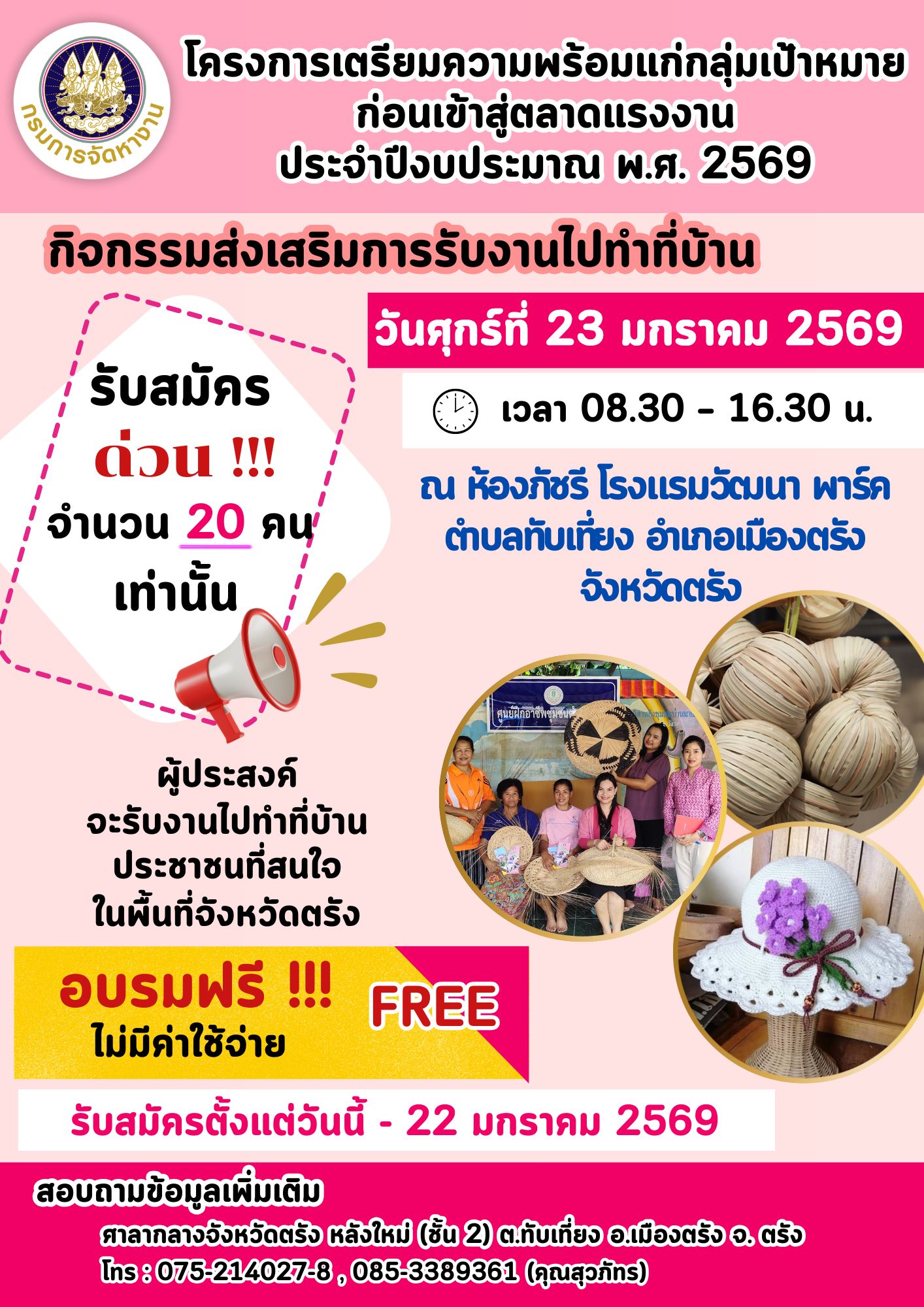สำนักงานจัดหางานจังหวัดตรัง รับสมัครผู้ประสงค์จะรับงานไปทำที่บ้าน ตามโครงการเตรียมความพร้อมแก่กลุ่มเป้าหมายก่อนเข้าสู่ตลาดแรงงาน กิจกรรมส่งเสริมการรับงานไปทำที่บ้าน ประจำปีงบประมาณ พ.ศ. 2569